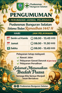 Sesuai Edaran Bupati Natuna Nomor 800.1.6.2/BKPSDM/II/2026 Tertanggal 12 Februari 2026 tentang Jam Kerja ASN selama bulan Ramadhan 1447H Pemerintah Kabupaten Natuna, berikut kami sampaikan jadwal pelayanan di UPTD Puskesmas Bunguran Selatan Kabupaten Natuna.